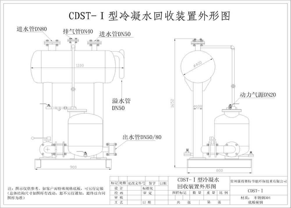 CDST系列冷凝水氣動機械回收組合泵裝置廣泛應用于石化、印染后整理、水洗、醫(yī)院、木材加工、食品烘干、造紙行業(yè)、飲料釀造、建筑樓宇等使用蒸汽能源的行業(yè),為企業(yè)節(jié)能減排,資源循環(huán)利用提供了幫助。本系列裝置將所有的附件完整地安裝在一個鋼制框架中,整體設計優(yōu)良,全不銹鋼304制作,方便現(xiàn)場接管安裝,無需電源(使用蒸汽或壓縮氣體作為動力),適用于危險、骯臟和潮濕環(huán)境,泵體內(nèi)部全機械結構,無電泵固有的汽蝕和機械密封現(xiàn)象,減少維修費用和停機時間,確保工作性能運行穩(wěn)定可靠,現(xiàn)場無需大水槽,降低了成本,是冷凝水回收的理想設備。CDST-Ⅱ型連續(xù)輸送冷凝水回收裝置已申請國家發(fā)明專利(申請專利號:201210000626.3)。本公司在2012年2月21日將康得賽特成功注冊為注冊商標。