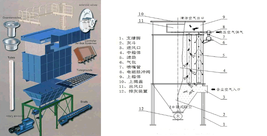 脈沖布袋除塵器由灰斗、上箱體、中箱體、布袋(根據(jù)煙氣溫度不同,可采用PTFE、P84等高性能復(fù)合布袋)、清灰噴吹裝置等部分組成。工作時,高溫?zé)煔庥苫叶飞系倪M風(fēng)口流入灰斗,由于重力沉降作用,粗塵粒直接落入灰斗底部,起到預(yù)收塵的作用,同時氣流速度變慢,輕微粉塵隨氣流轉(zhuǎn)折向上進入中箱體,粉塵被高溫濾袋過濾阻留,積附在濾袋外表面,過濾后的氣體透過濾袋進入上箱體至出風(fēng)口,經(jīng)引風(fēng)機排至大氣。積附在濾袋外壁的粉塵不斷增加,當(dāng)達到設(shè)定時間,脈沖控制儀順序間隔觸發(fā)開啟脈沖電磁閥,使壓縮空氣包內(nèi)的壓縮空氣經(jīng)噴吹管對各排濾袋進行脈沖噴吹清灰,使濾袋在瞬間急劇膨脹抖落積附在濾袋外壁的粉塵,從濾袋上剝離的粉塵沉降至灰斗,經(jīng)過卸灰閘閥排出,除塵效率≥99%,適應(yīng)于各種除塵行業(yè)。